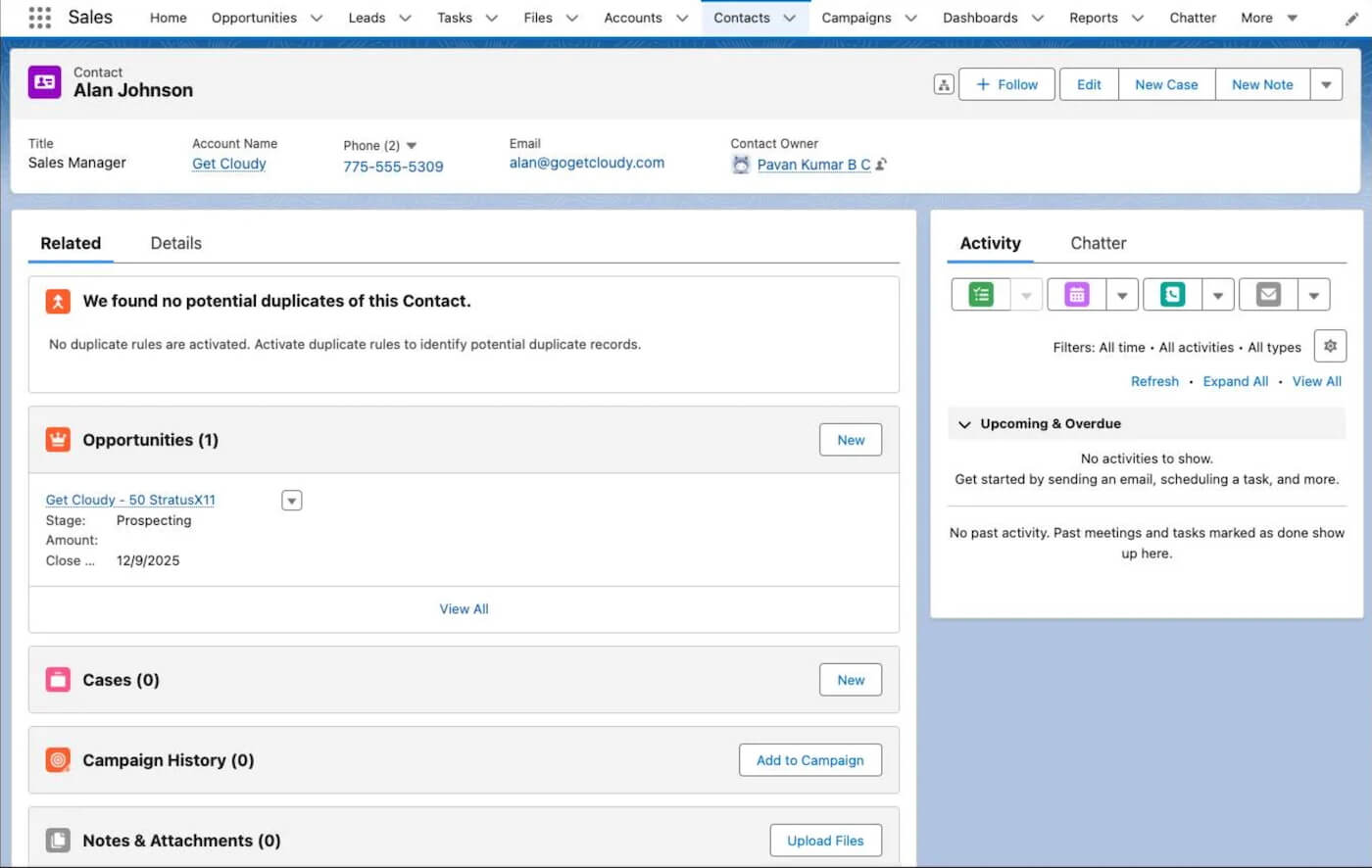 Salesforce provides a structured contact view that centralizes related opportunities, activities, cases, and campaign history for more complete account insights. (Source: Salesforce)