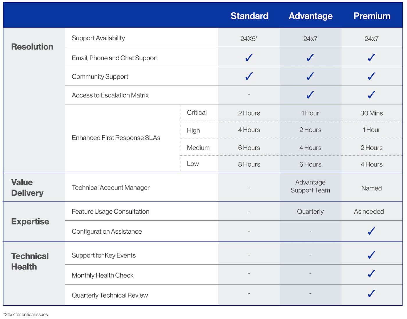 | Standard business hours | 24-hour support on weekdays | Support during local business hours; 24/7 access is available only on premium support plans |