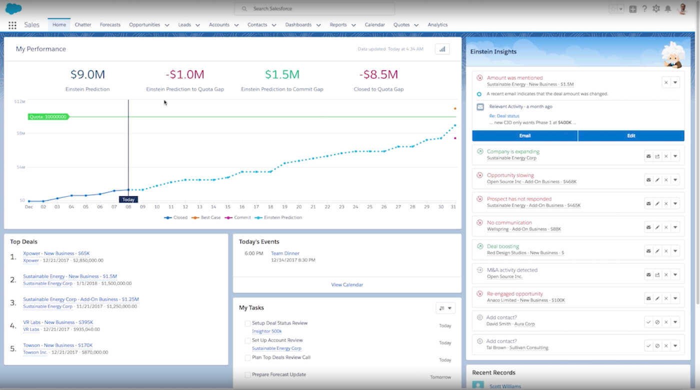 Einstein AI in Salesforce delivers predictive insights, opportunity alerts, and performance forecasts to help sales teams prioritize actions and close deals more effectively. (Source: Salesforce)
