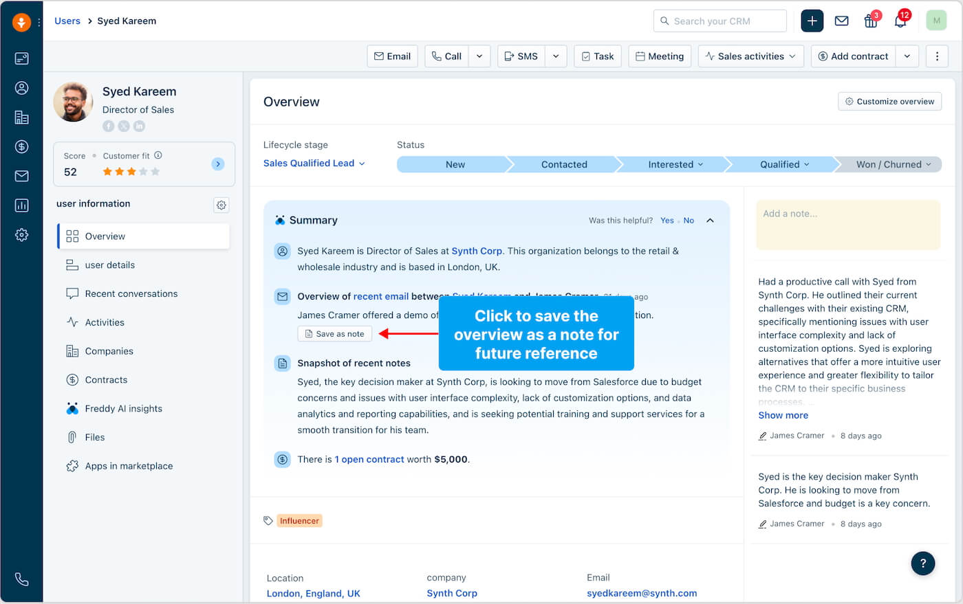 Freddy AI in Freshsales surfaces key insights, summarizes conversations, and highlights important details to help reps follow up faster and stay organized. (Source: Freshsales)
