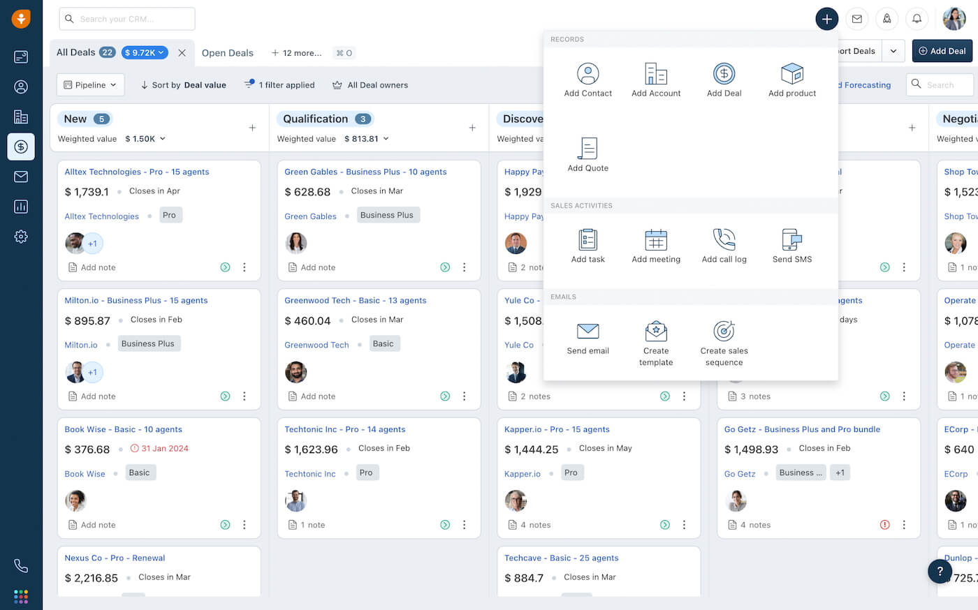 Freshsales’ visual pipeline provides easy access to core sales features like deal tracking, contact management, task creation, email tools, and AI-supported workflows. (Source: Freshsales)