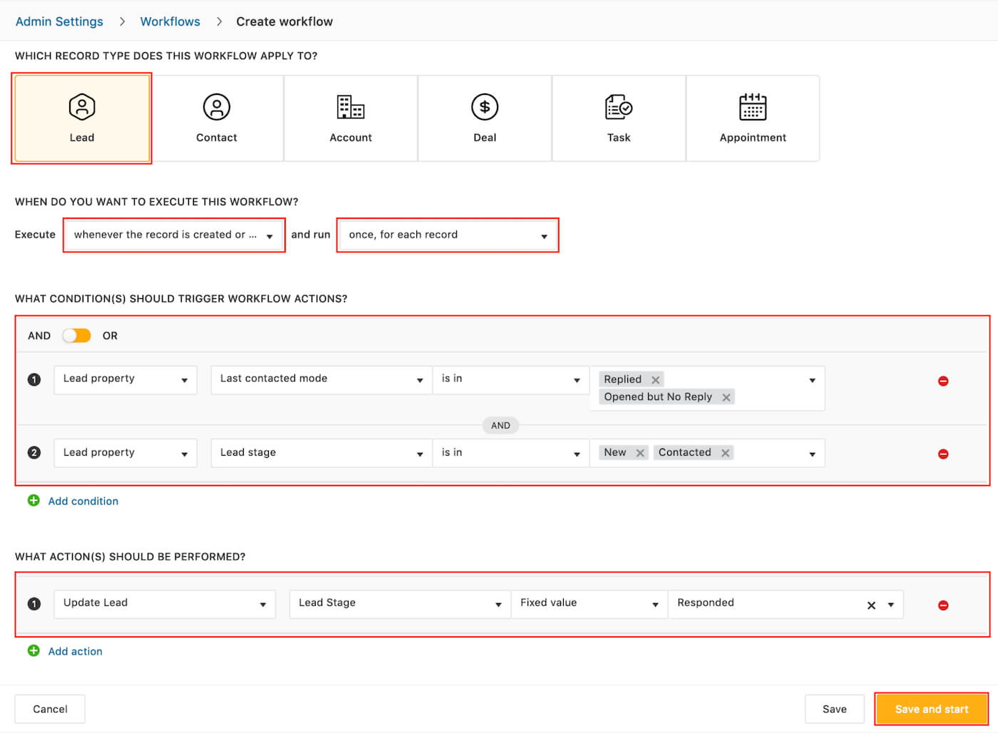 Freshsales provides an easy-to-use workflow builder with automation for leads, contacts, deals, and tasks. Its interface is simple, and higher plans add time-based workflows.