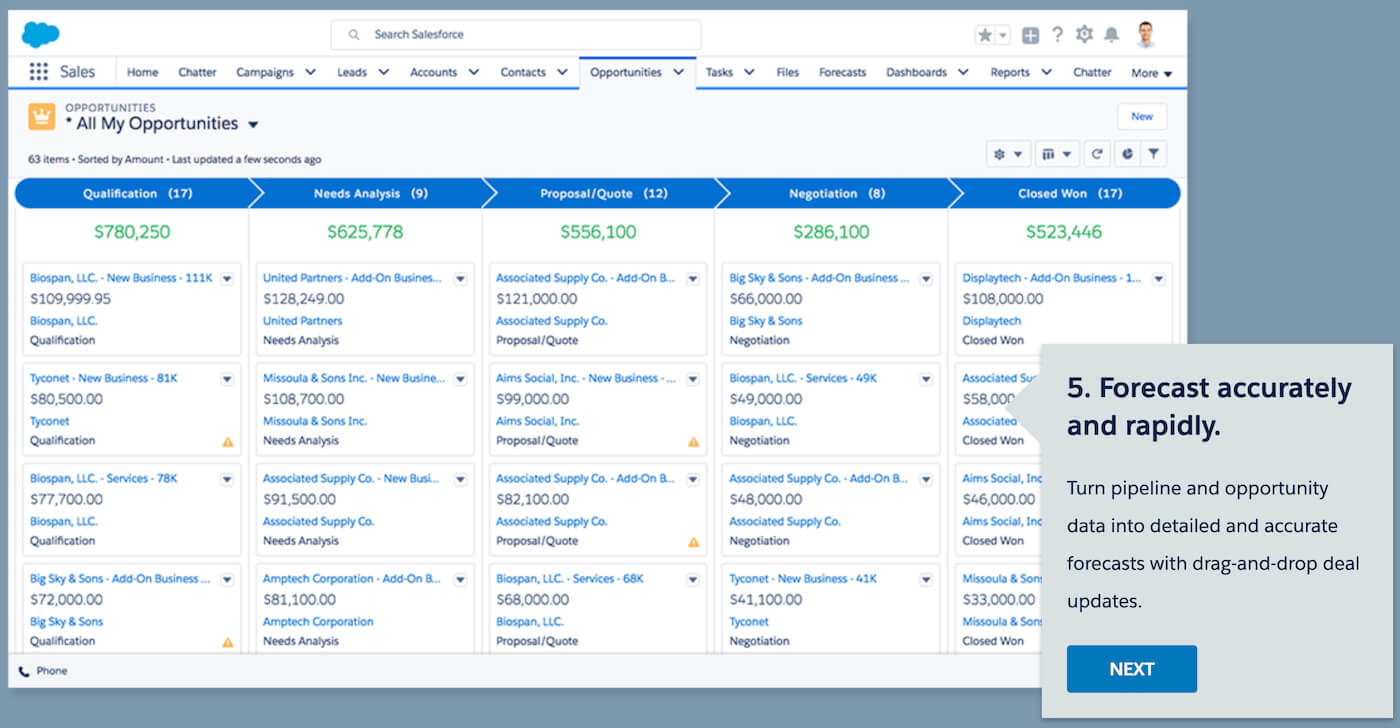 Salesforce’s opportunity management system features drag-and-drop pipeline stages, real-time deal values, and built-in forecasting tools to help teams track and prioritize deals more accurately. (Source: Salesforce)