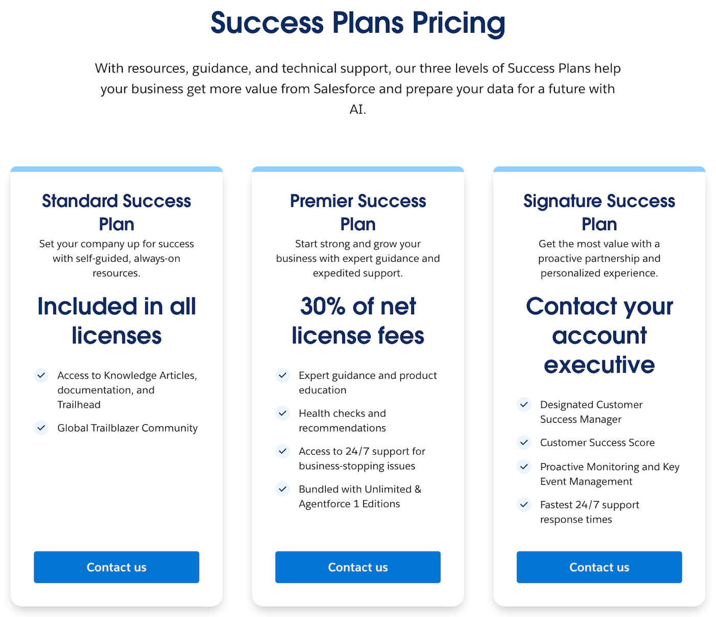 Salesforce offers tiered Success Plans that range from self-guided resources to full 24/7 expert support and dedicated customer success management. (Source: Salesforce)