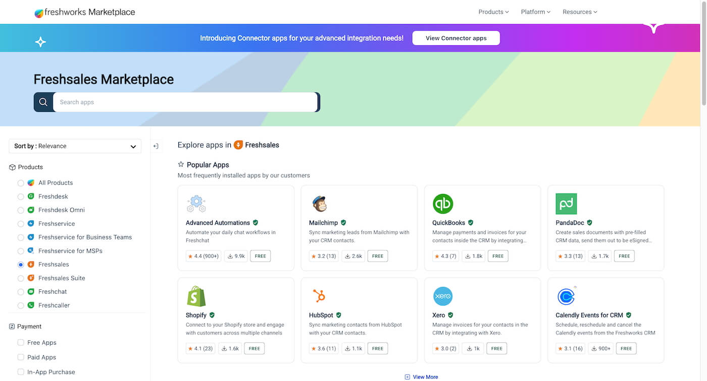 Freshsales connects with popular tools through the Freshworks Marketplace, offering essential integrations for marketing, accounting, automation, and scheduling. (Source: Freshworks)