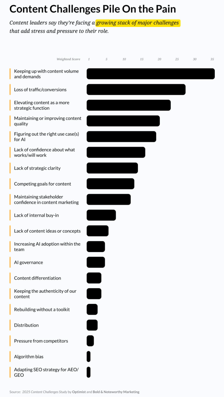 That’s what the recent Yes Optimist content marketing survey found. Most of the 50+ content leaders said they’re stuck in a strange limbo where they know their current playbook isn’t working, but they’re unsure what comes next. |